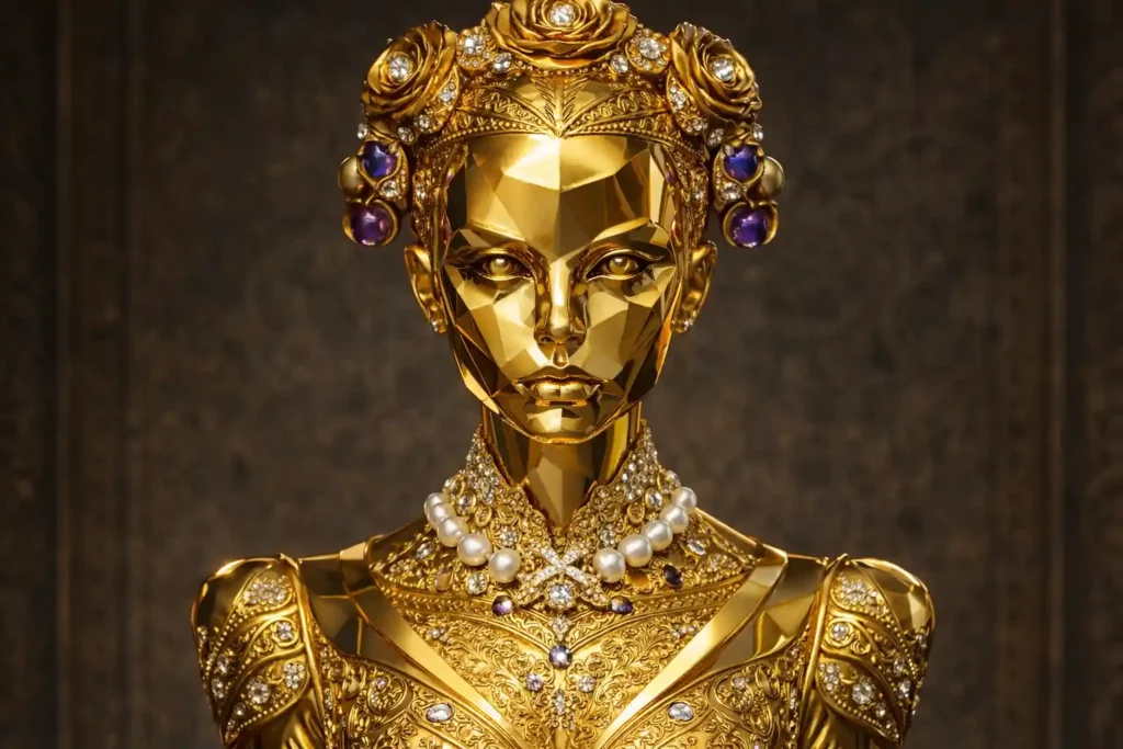 Deze monumentale sculptuur is een eerbetoon aan verfijning, abstractie en ambacht. Het kunstobject is volledig vervaardigd uit gepolijst goud en vertaalt menselijke proporties naar een geometrisch, gebeeldhouwd silhouet. De gelaatstrekken zijn niet realistisch uitgewerkt, maar opgebouwd uit gefacetteerde vlakken, strakke lijnen en subtiele reliëfs die het licht op uiteenlopende manieren vangen en reflecteren.